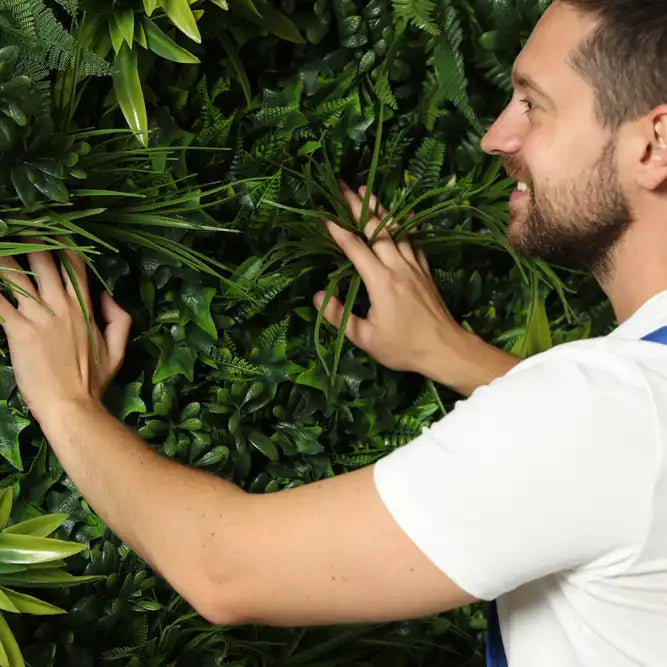 Installation kits make your faux green wall easy to install with only one person and a power drill. Of course, it becomes even easier with an extra set of hands.