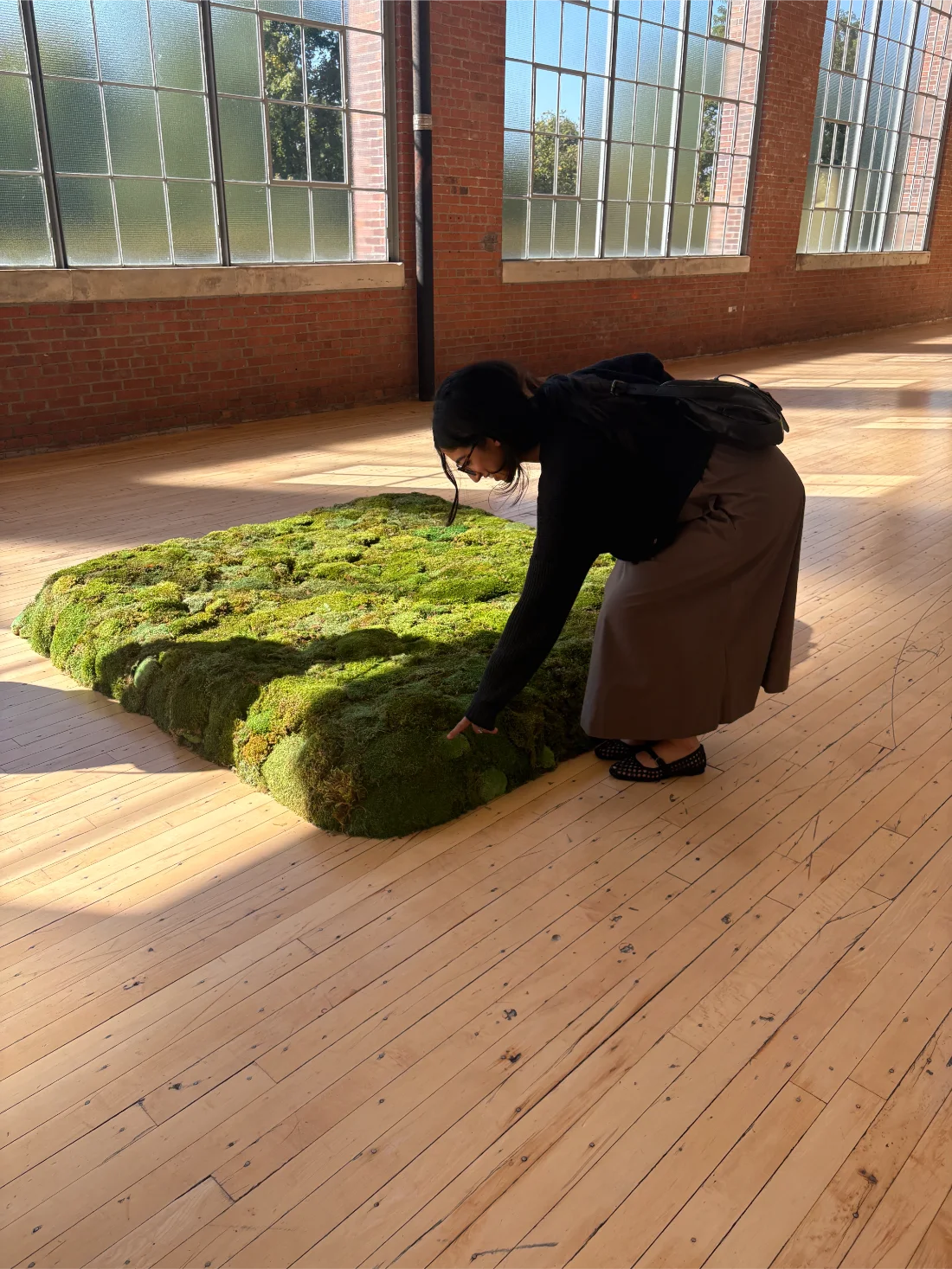 Later, in a completely different setting — a museum — I found myself face-to-face with moss again. Meg Webster’s installation sat quietly in the center of a bright white room: a moss bed, precise and square, a forest condensed into geometry.
