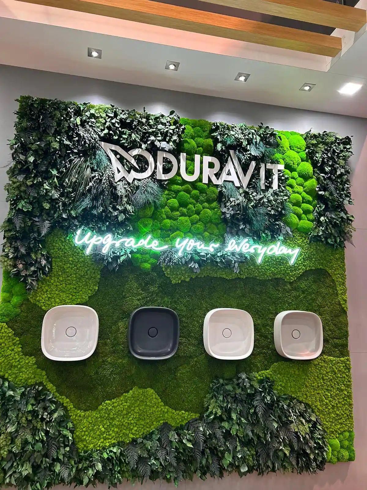 In retail interiors, moss walls function as both a design statement and a brand signature. They draw customers into the space, frame products, and reinforce sustainability-forward storytelling. Placement is critical in these settings. Moss walls should be installed away from storefront glass, direct UV exposure, and fluctuating exterior temperatures. When placed deeper within the store or in shaded feature zones, moss walls maintain their vibrancy while becoming one of the most photographed elements in the space. This relationship between brand, placement, and longevity comes to life in this project we did for Duravit’s tradeshow display in Las Vegas, NV.