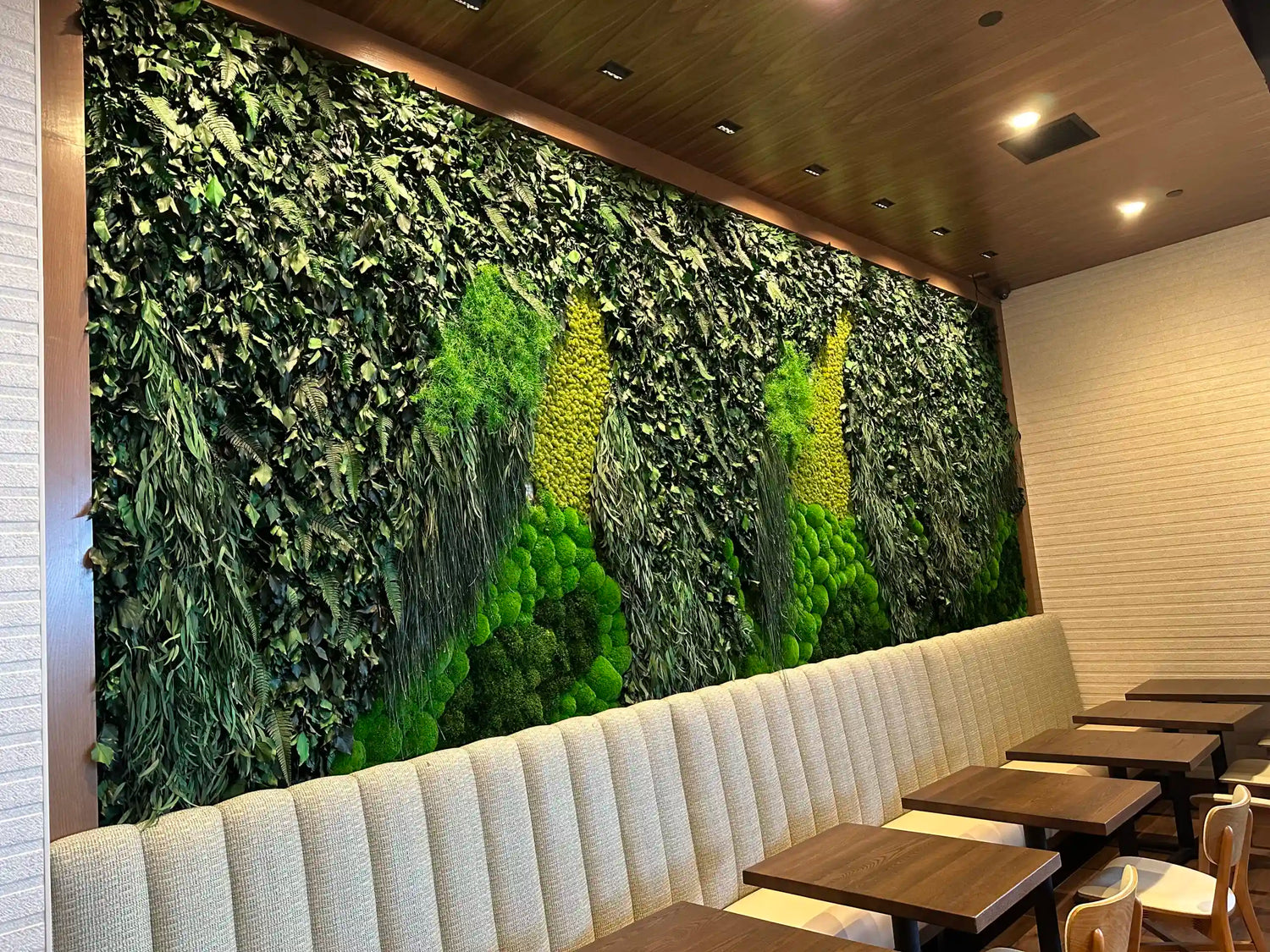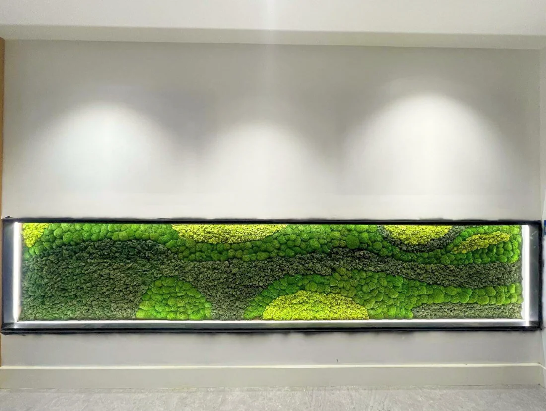 Unlike artificial greenery, moss walls respond to their environment because they are made from real preserved material. For optimal performance, moss walls must be placed in spaces that maintain consistent indoor conditions. Direct sunlight can cause fading. Excess humidity can compromise structure. Strong HVAC airflow can dry out surface texture. For this reason, moss walls belong in interior commercial spaces with regulated temperature, controlled lighting, and balanced airflow. When these conditions are met, moss walls deliver long-term beauty without ongoing maintenance.