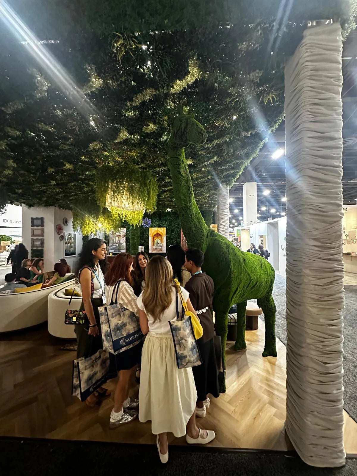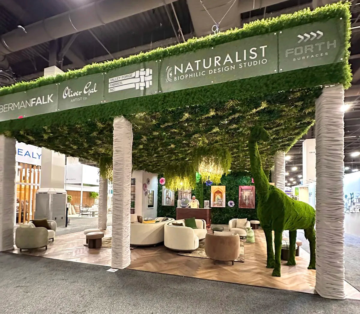 Our lush ceiling, completely covered in our biophilic bliss panels, paired with custom chandeliers draped in greenery, created a softly lit, tranquil ambience that made people feel instantly at ease. It became a natural gathering space where visitors lingered, enjoyed drinks from the bar, took meetings, and of course, lined up to snap photos with our very own moss-covered giraffe, who quickly became a fan favorite and social media star.