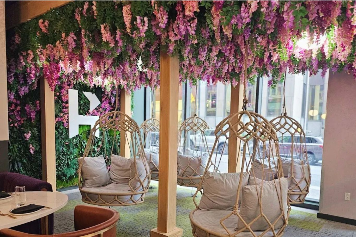 For The Draft, located in a bustling food hall, we designed and installed custom hanging plant installations accented with pops of lavender. Suspended high above the space, these vibrant, low-maintenance arrangements create a striking visual focal point, adding color, texture, and movement while drawing the eye upward. Carefully curated to complement the interior design, the installations introduce a playful yet sophisticated biophilic element that enhances the lively, communal atmosphere and elevates the overall dining experience.