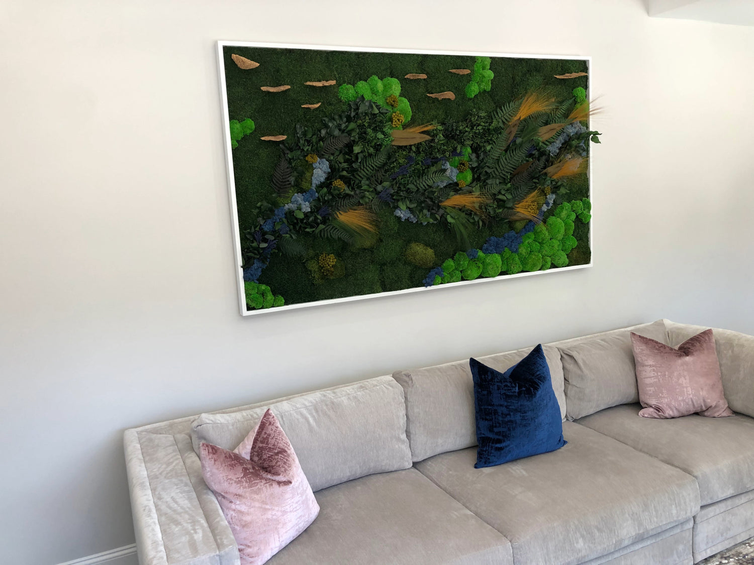 Nestled in the scenic village of Kings Point, NY, this custom 3' x 5' framed moss wall was designed as a stunning biophilic statement piece for the home of Ashley Shurka. Known for its picturesque waterfront properties and lush green landscapes, Kings Point is an idyllic setting that blends nature with elegant residential living. Our goal was to create a piece that harmonized with this environment while adding a distinctive, organic touch to the home’s interior.