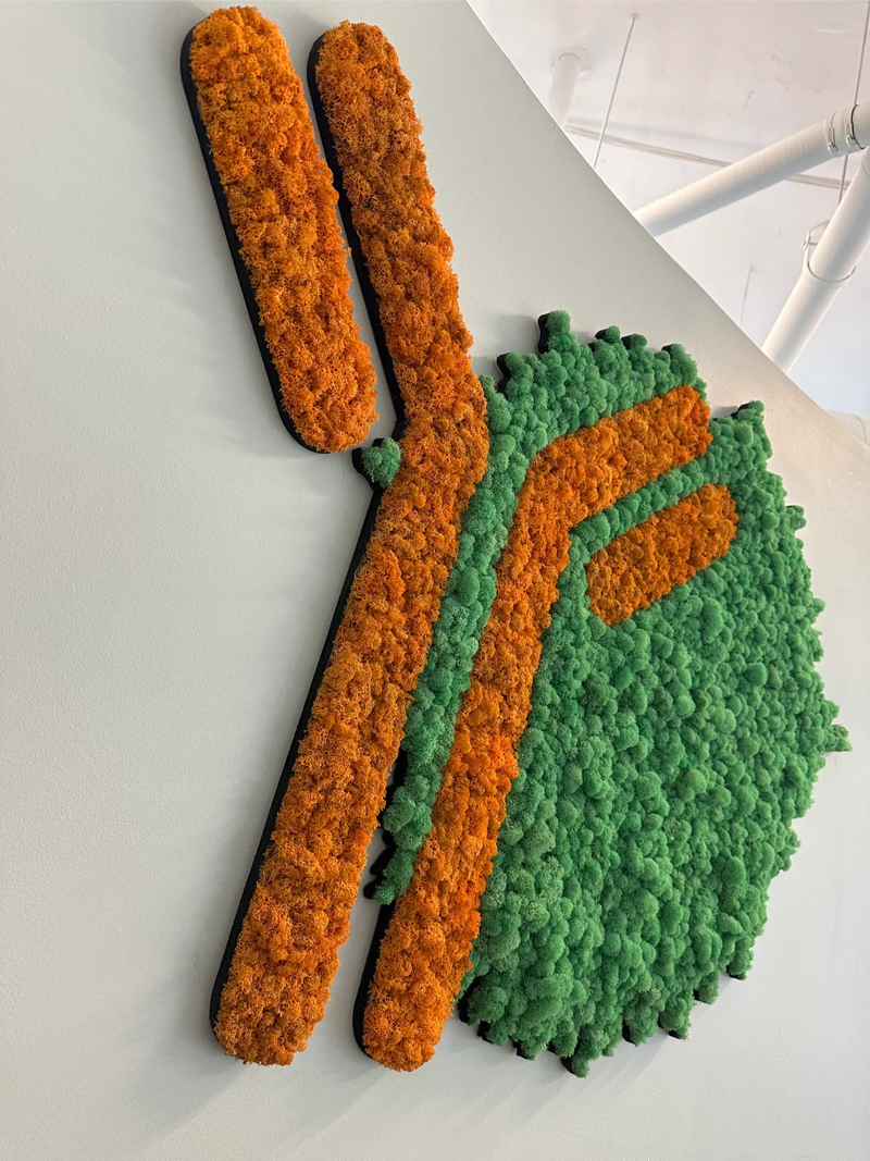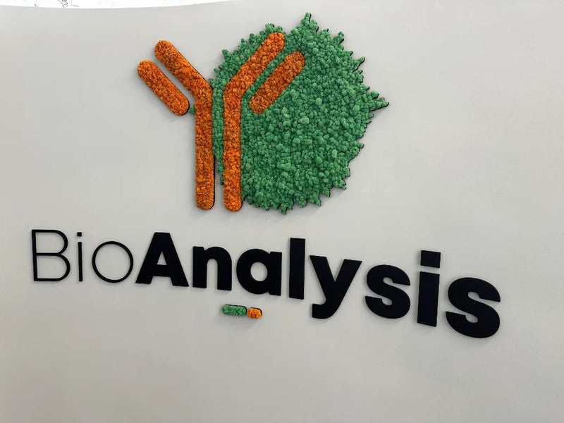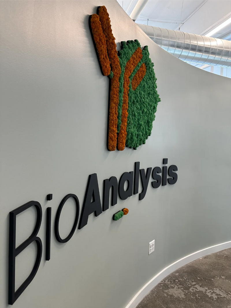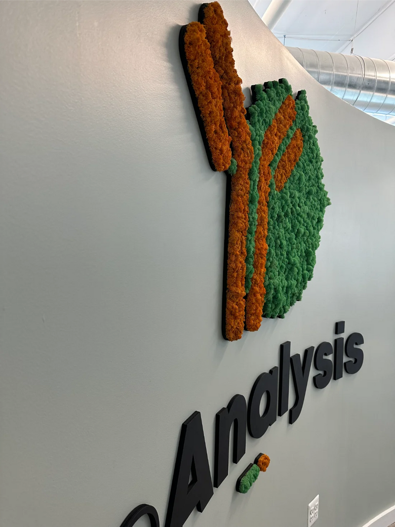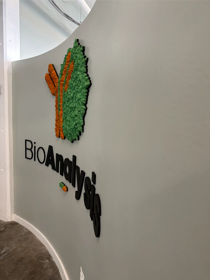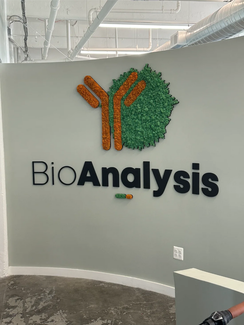 This custom moss logo installation for BioAnalysis in Philadelphia brings a natural, human-centered element into a highly technical science lab and office environment. Designed using preserved Reindeer Moss, the 20-square-foot moss wall transforms the company’s logo into refined moss art that reflects BioAnalysis’s commitment to collaboration, innovation, and thoughtful decision-making within the life sciences industry. Rooted in biophilic design, the installation softens the workplace with organic texture while reinforcing the company’s mission-driven culture—one that values knowledge sharing, inclusivity, and community impact. The result is a distinctive moss wall feature that balances scientific precision with natural warmth, creating a welcoming visual anchor within a forward-thinking research and office setting.