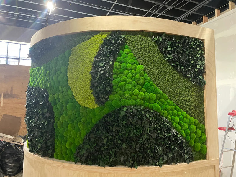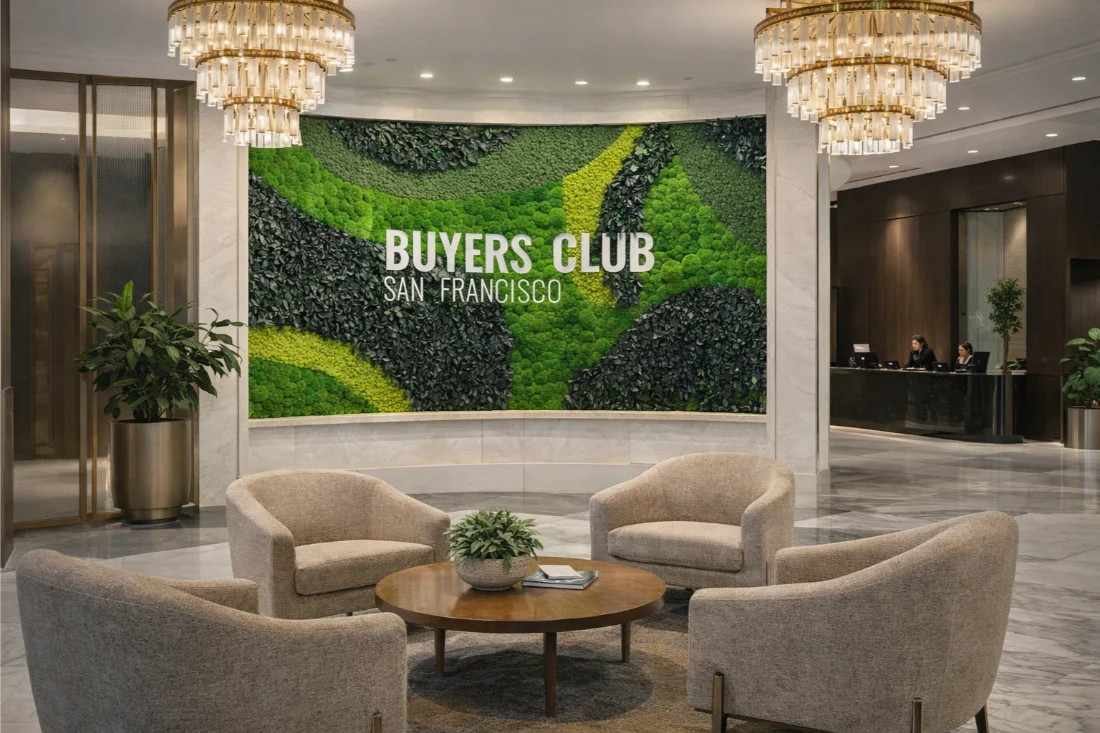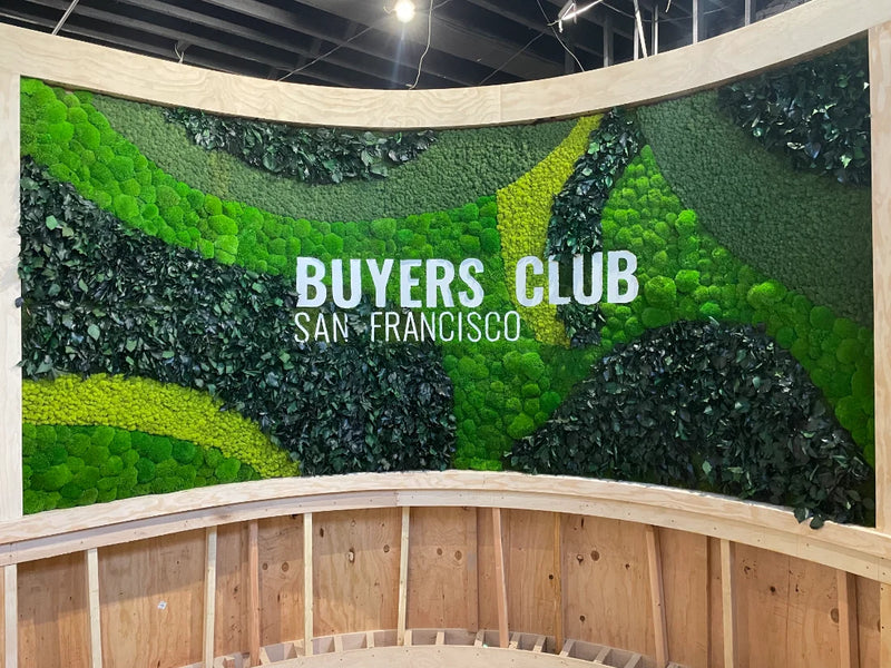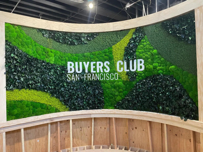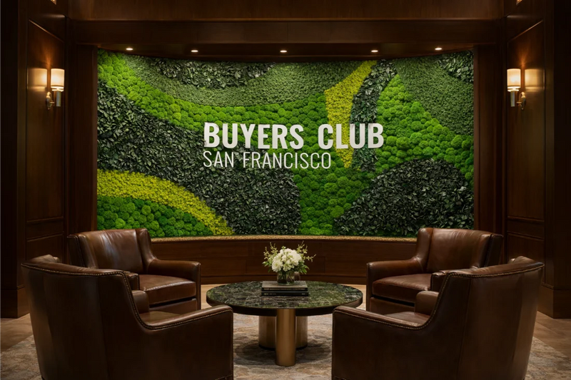 This custom curved moss wall installation for Buyers Club, an exclusive members-only club in San Francisco, was designed as a bold yet refined expression of biophilic design. Spanning 250 square feet, the double-sided moss logo feature allows members to experience the preserved moss art both upon entry and again after check-in, creating a seamless and immersive arrival moment. Crafted with a layered blend of preserved Mood Moss, Bun Moss, Flat Moss, and Reindeer Moss, the curved moss wall adds depth, movement, and organic texture to the club’s interior architecture. The result is a sophisticated moss wall that reinforces exclusivity and identity while introducing a calming, nature-inspired presence into a high-end social environment.