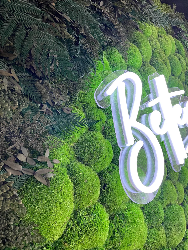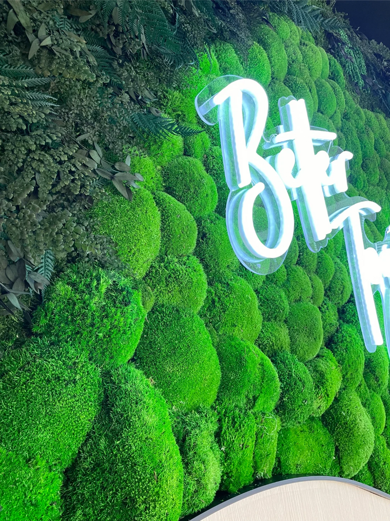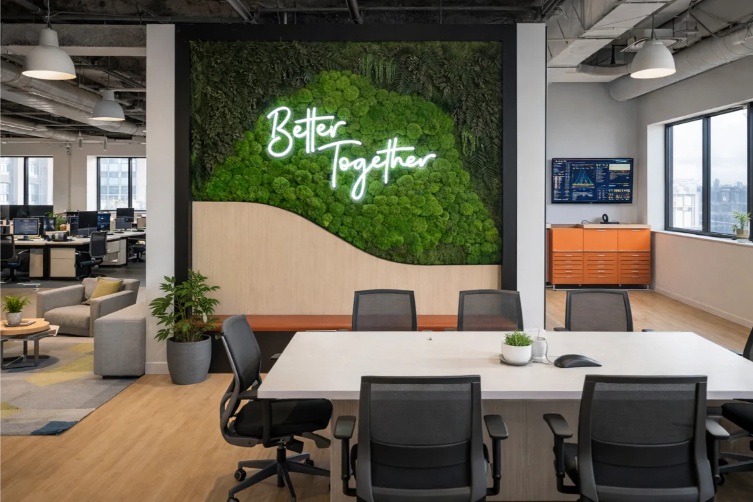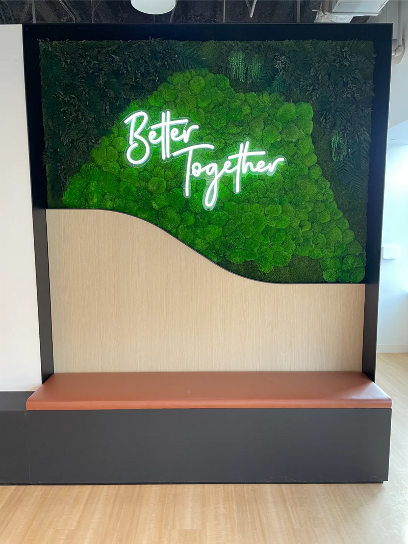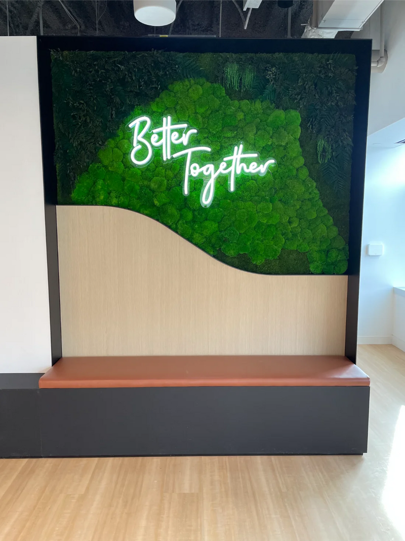 This preserved moss wall installation for Flex by JLL was designed as a welcoming focal point within a modern office environment, blending natural texture with intentional messaging through biophilic design. Featuring a custom scalloped bottom edge, the moss wall softens the architectural lines of the space while adding an organic, artful presence that feels both refined and approachable. An integrated LED neon sign reading “Better Together” reinforces Flex by JLL’s community-driven ethos, transforming the wall into both impactful moss art and a meaningful gathering point. The result is a design-forward office feature that enhances visual interest, encourages connection, and brings the calming influence of nature into a collaborative workplace setting.