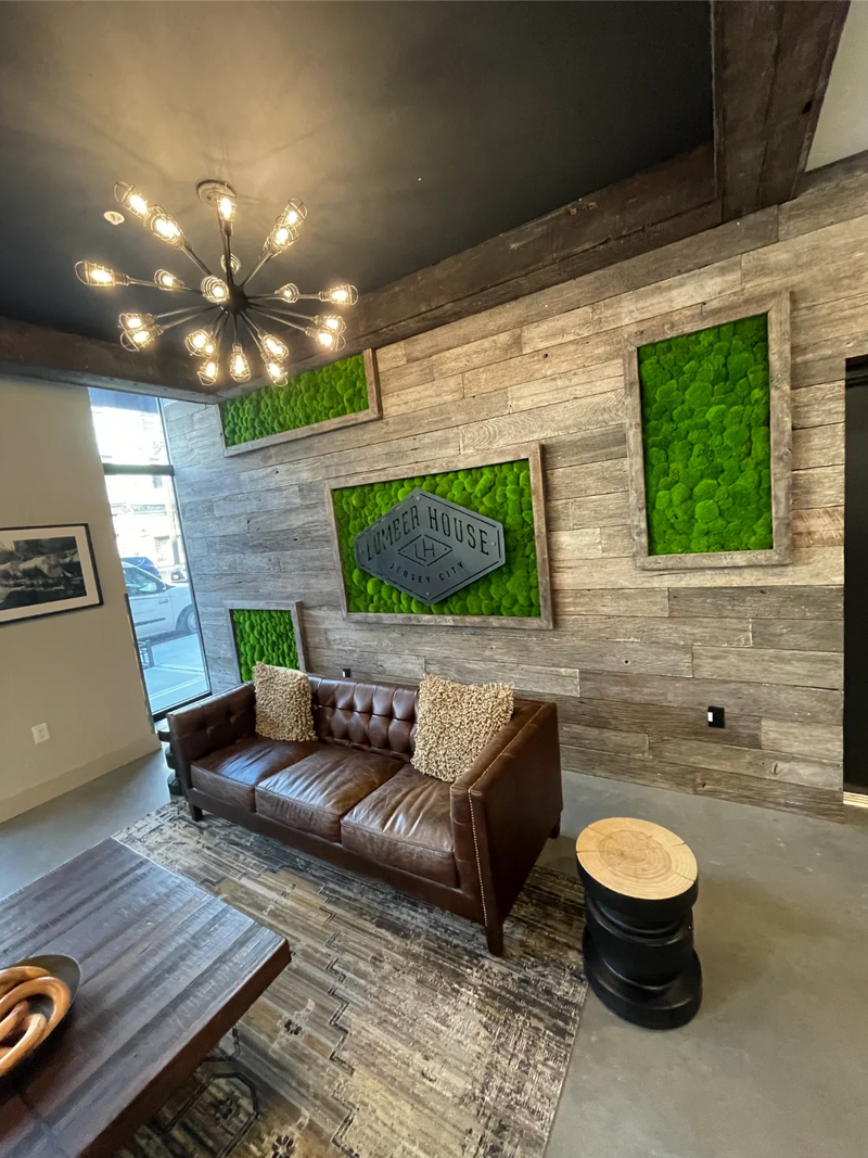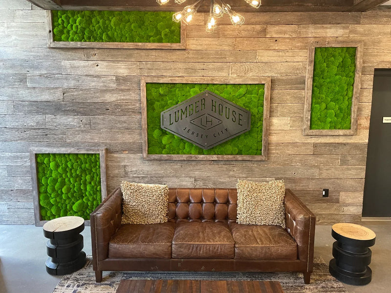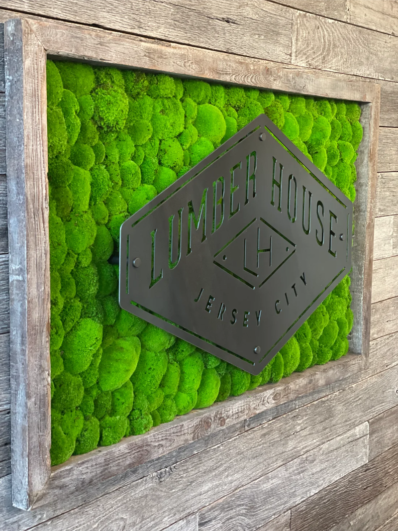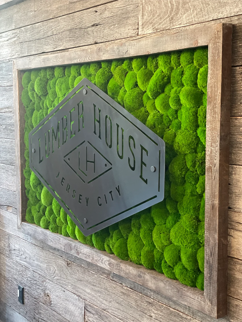 This custom moss wall installation for Hudson River Trading transforms the corporate office café into a vibrant, brand-forward gathering space rooted in biophilic design. Designed as a bold moss logo feature, the wall uses preserved Reindeer Moss in Hudson River Trading’s signature orange, creating a striking visual statement that seamlessly blends corporate identity with natural texture. Spanning 60 square feet, the moss art adds warmth and energy to the café environment while softening the architectural lines of the space. The result is a modern moss wall that enhances employee experience, encourages connection, and demonstrates how thoughtful biophilic design can elevate corporate interiors through color, craftsmanship, and brand storytelling.