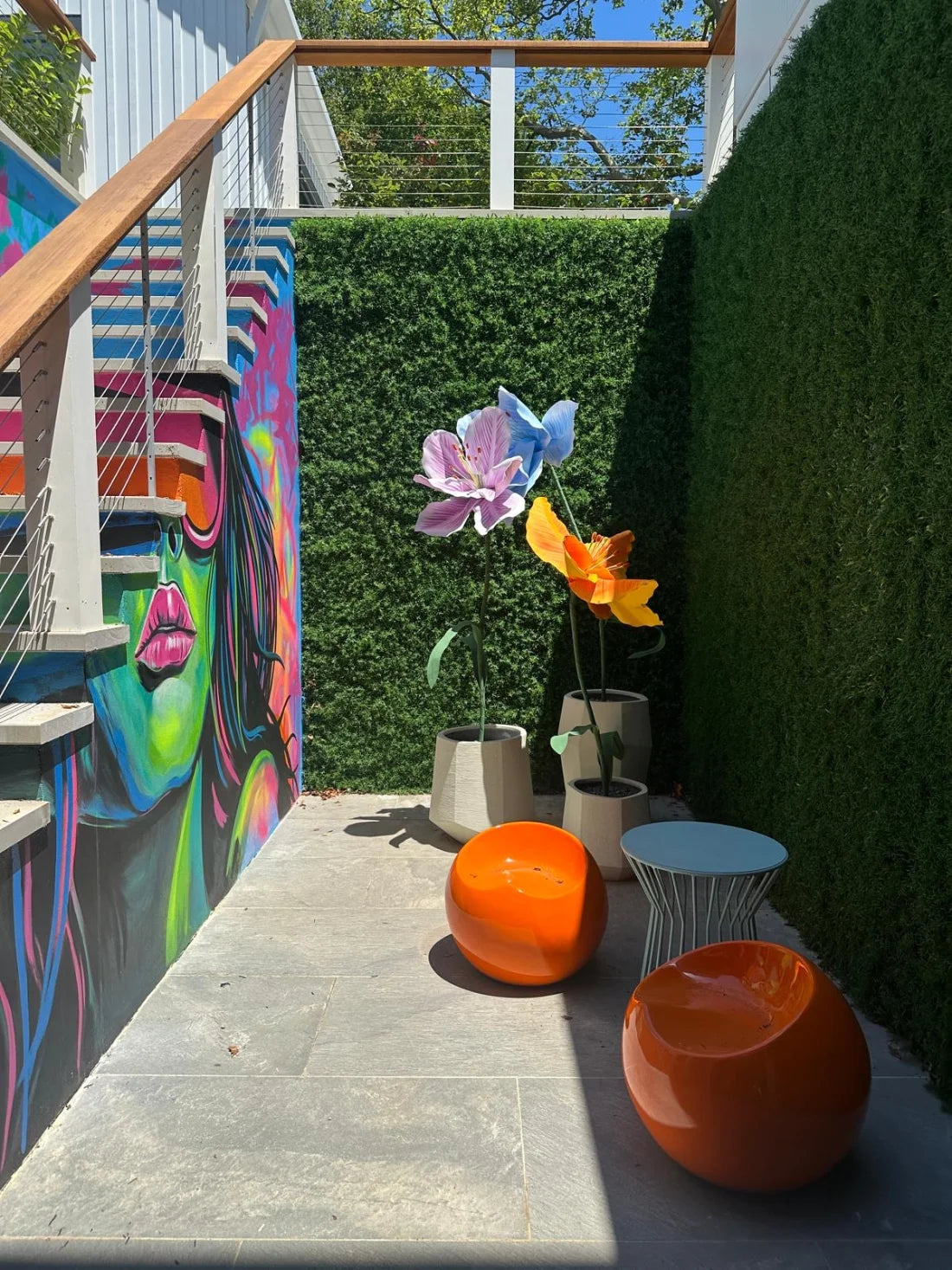 For this vibrant private residence in Long Island, NY, Adam Cassino reimagined a traditional patio into a bold, artful escape. Featuring 150 square feet of our Green Meadows Artificial Wall Garden panels, the installation delivers lush, maintenance-free greenery that adds texture and depth to the eclectic outdoor space. Anchored by a striking face mural and colorful, statement-making furniture, the design creates an immersive environment that blends biophilic beauty with artistic expression. The artificial green wall brings lasting vibrancy, while enhancing privacy and softening hardscapes, making it an ideal choice for residential retreats seeking a balance of personality and natural-inspired design.