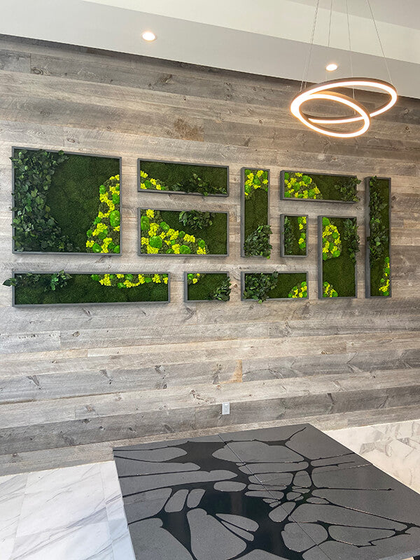 Oftentimes, we get to combine both of our concepts in one space, and the effect on the ambiance is nothing short of positive. Imagine walking into the lobby of your building after a long day at work, you know, on one of those days when your boss was all over you, you received 45 new emails and the printer broke again… but when you arrive home, you are greeted by a preserved lush wall garden that always looks fresh, vibrant, and comforting. Our team designed and installed a majestic wall garden in the lobby of this modern building. Using Flat Moss, Bun Moss, Hedera, Pitto Sporum, Brunia, and preserved plants, we created a lush and leafy oasis indoors! Following the principles of biophilic design in our creations, we hope to encourage the connection between nature and ourselves in our work and living environments. We have combined this dark green lush wall with one of our black epoxy resin tables that seamlessly flows into the caramel tones of the walnut wood. Take a seat while you wait your turn for the elevator and get lost in the natural details around you. Just across the lobby is a gallery wall that includes eleven framed custom preserved wall gardens. Each piece has its own design that plays into the larger picture. What a way to end the day… and start anew again. Contact Naturalist USA today to create your own wall garden.