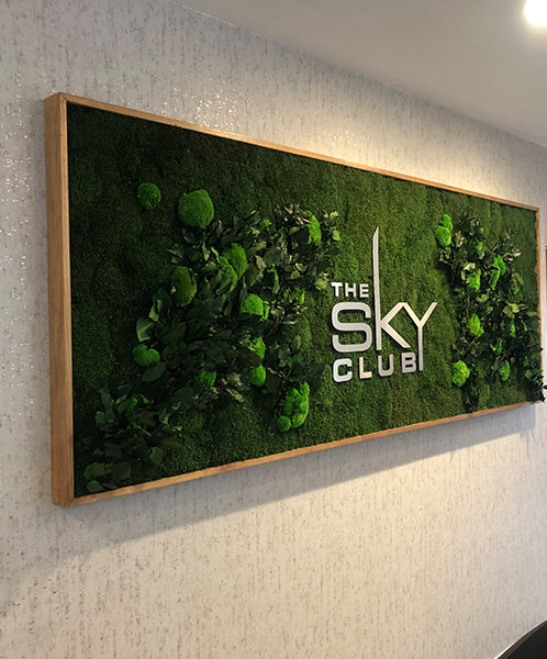 Our team came up with a stunning design for this moss wall, using plants like Flat Moss, Bun Moss, Ferns, and Hedera Leaves. They helped create a charming, textured look that perfectly framed the Sky Club logo. The gorgeous framed moss wall now greets all the visitors of this residential lobby.