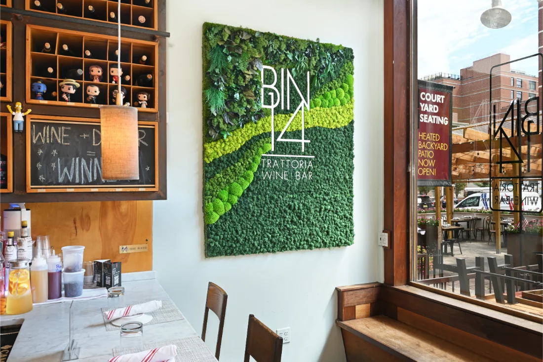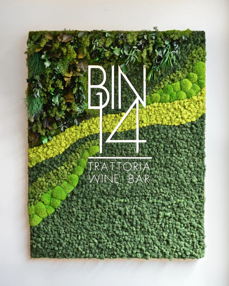 This custom moss wall installation for Hudson River Trading transforms the corporate office café into a vibrant, brand-forward gathering space rooted in biophilic design. Designed as a bold moss logo feature, the wall uses preserved Reindeer Moss in Hudson River Trading’s signature orange, creating a striking visual statement that seamlessly blends corporate identity with natural texture. Spanning 60 square feet, the moss art adds warmth and energy to the café environment while softening the architectural lines of the space. The result is a modern moss wall that enhances employee experience, encourages connection, and demonstrates how thoughtful biophilic design can elevate corporate interiors through color, craftsmanship, and brand storytelling.